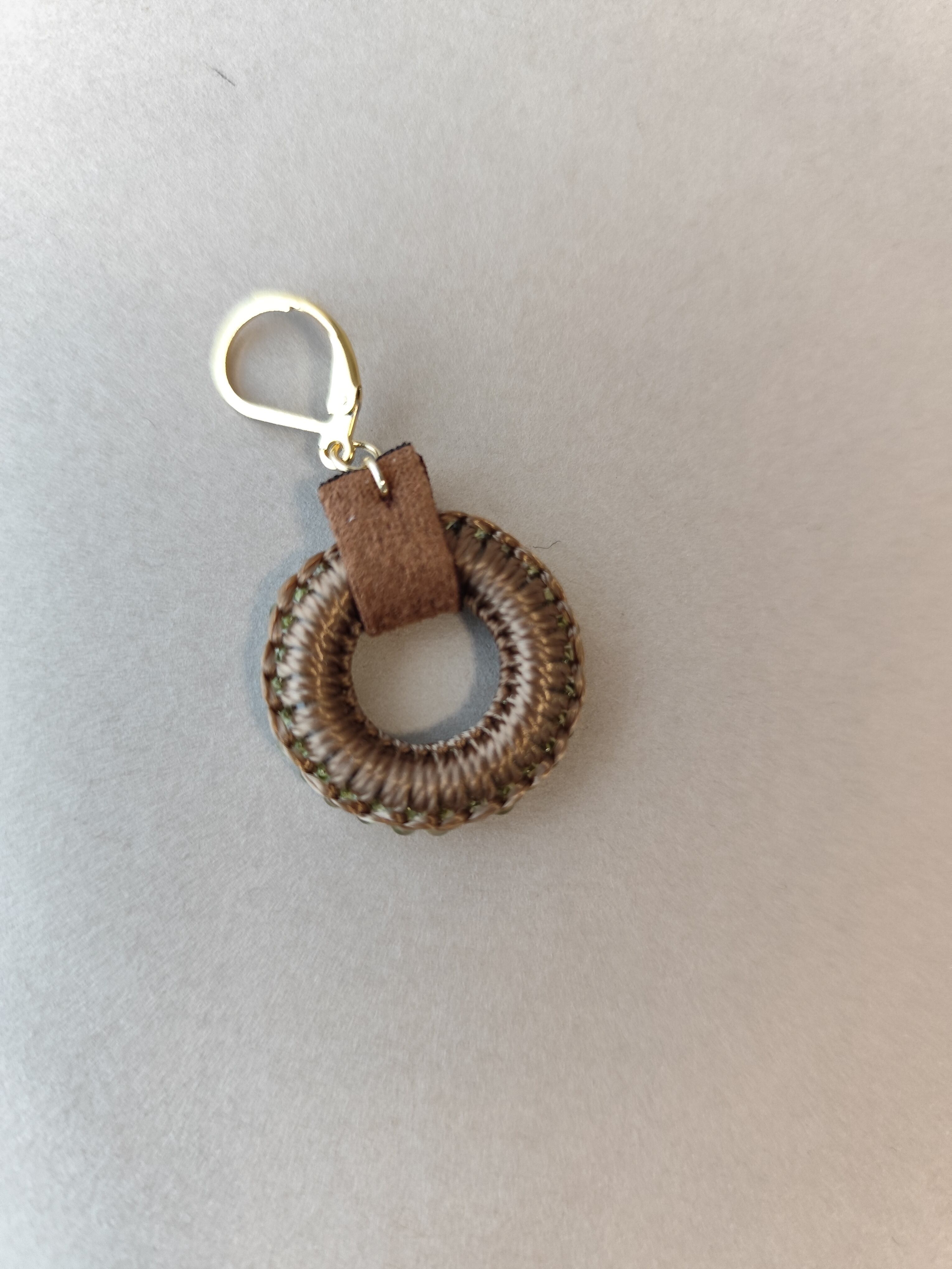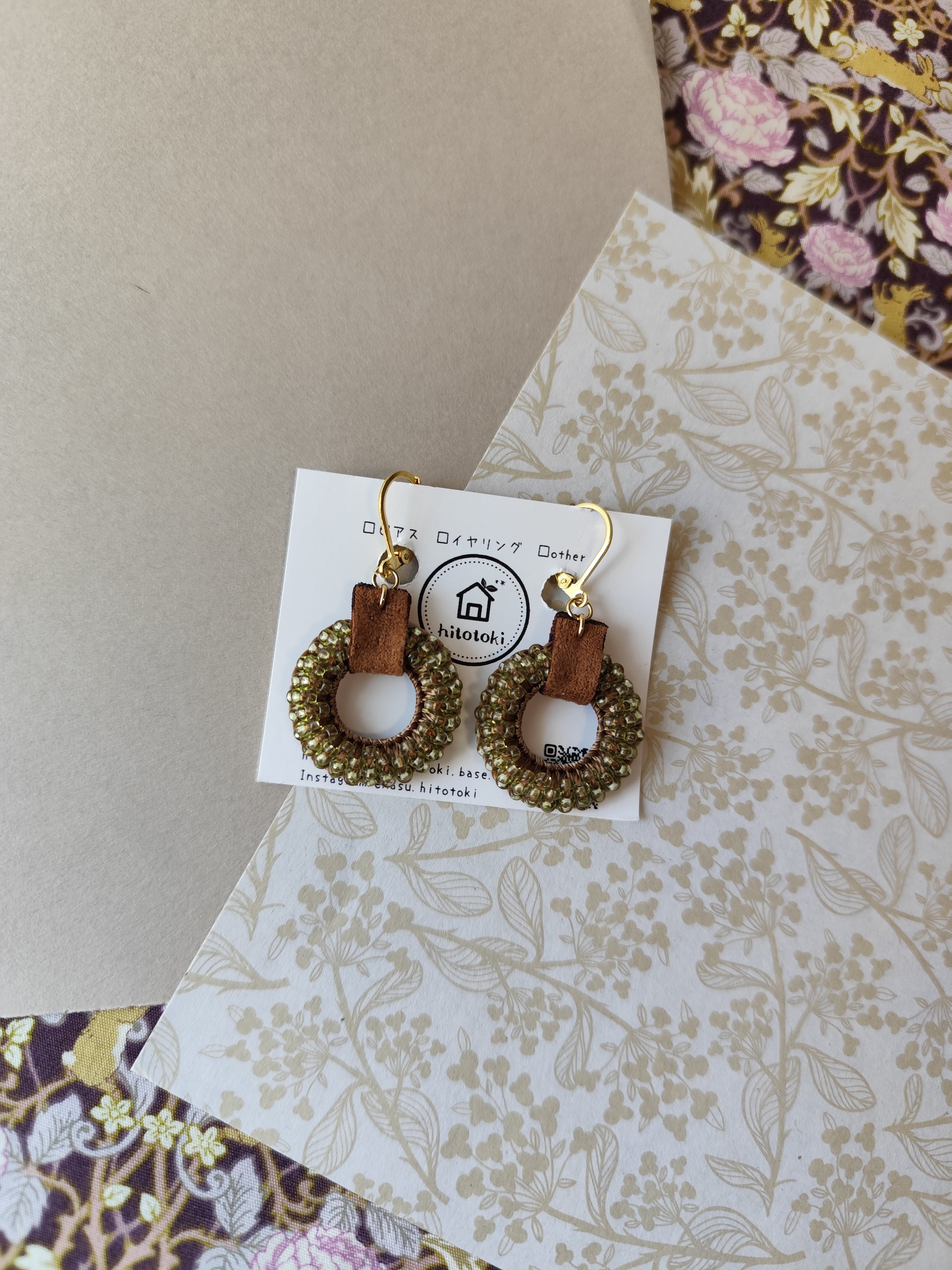 明るめのブラウンの糸にオリーブグリーンのビーズを合わせました。