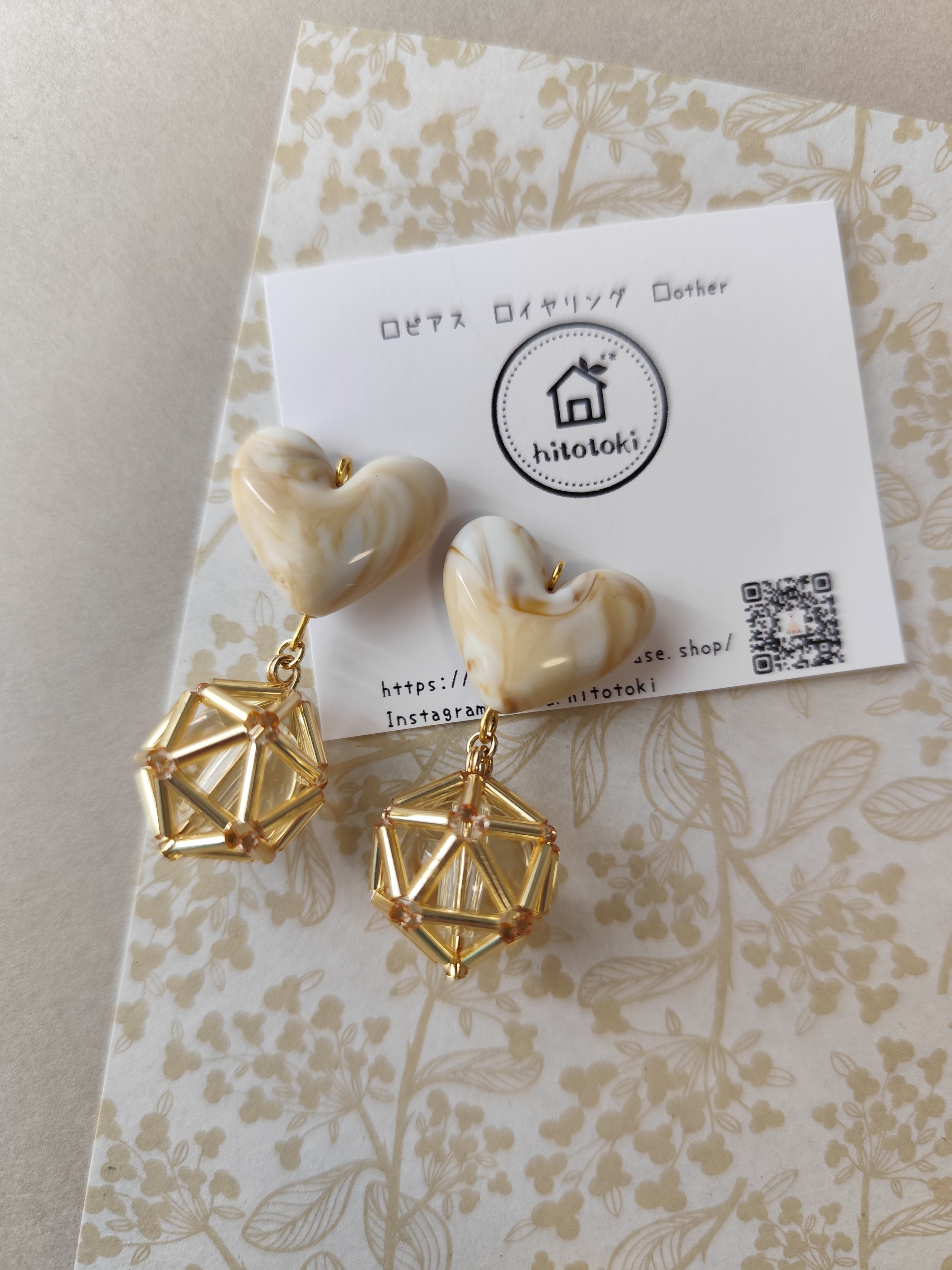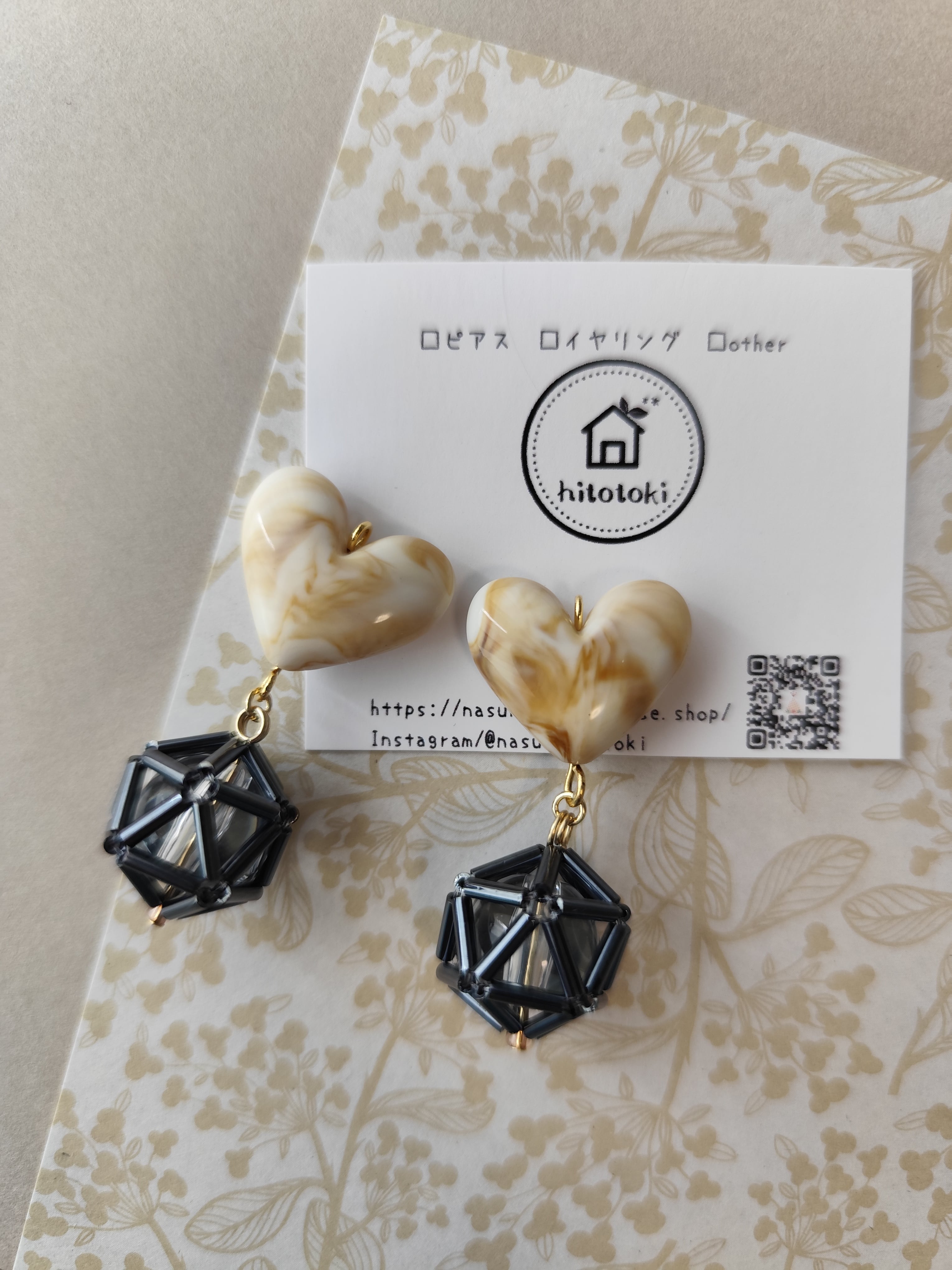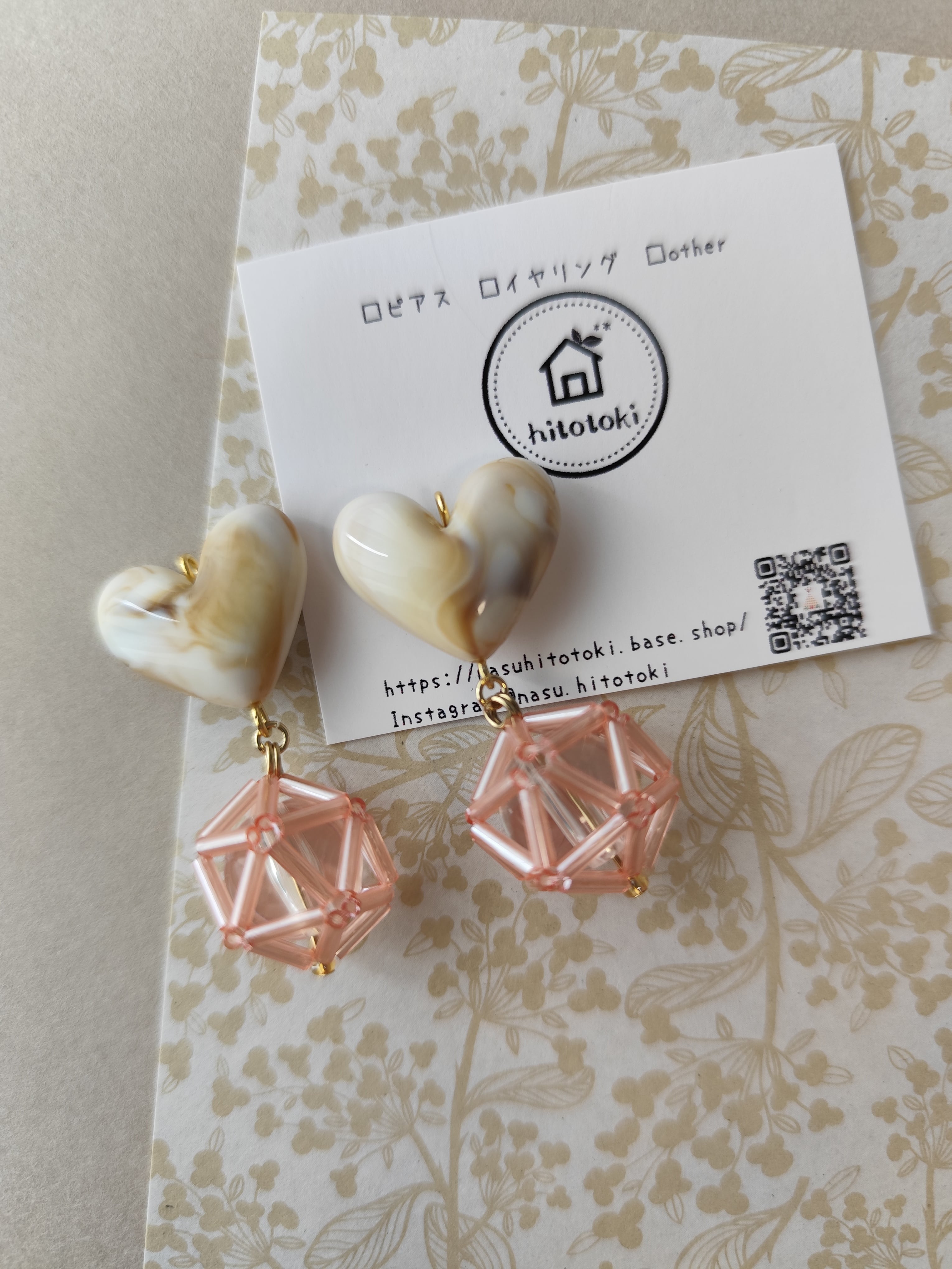 竹ビーズで編んだボールとマーブル模様の美味しそうなぷっくりハートを組み合わせたアクセサリーです。