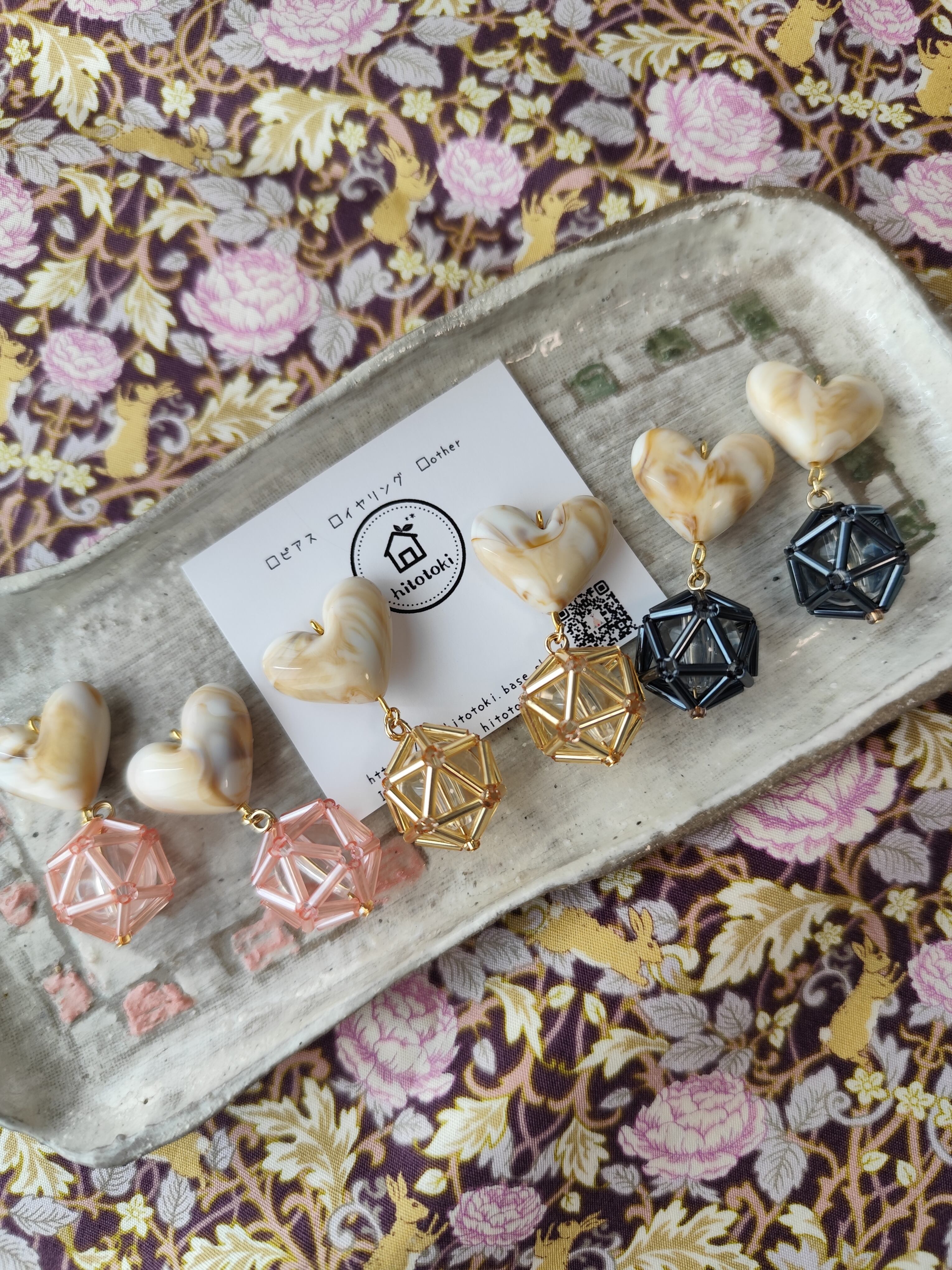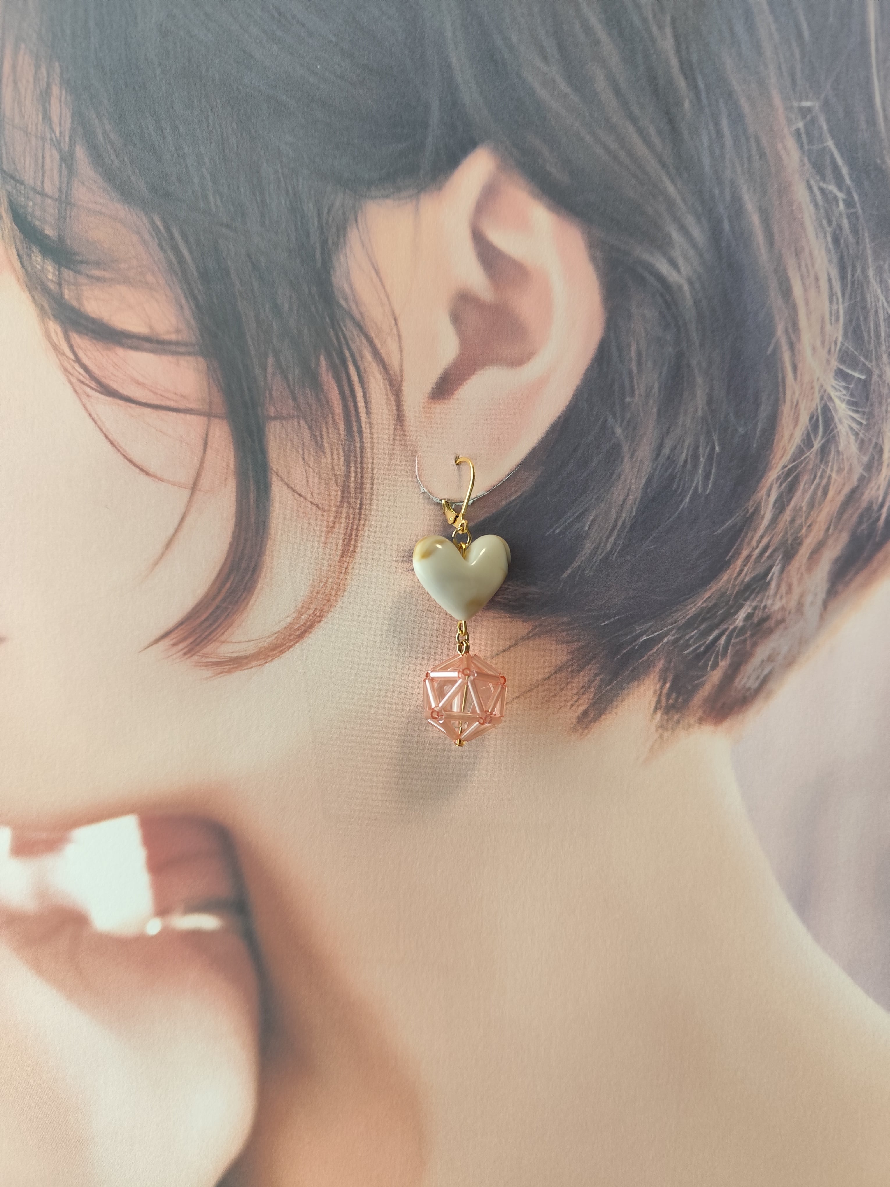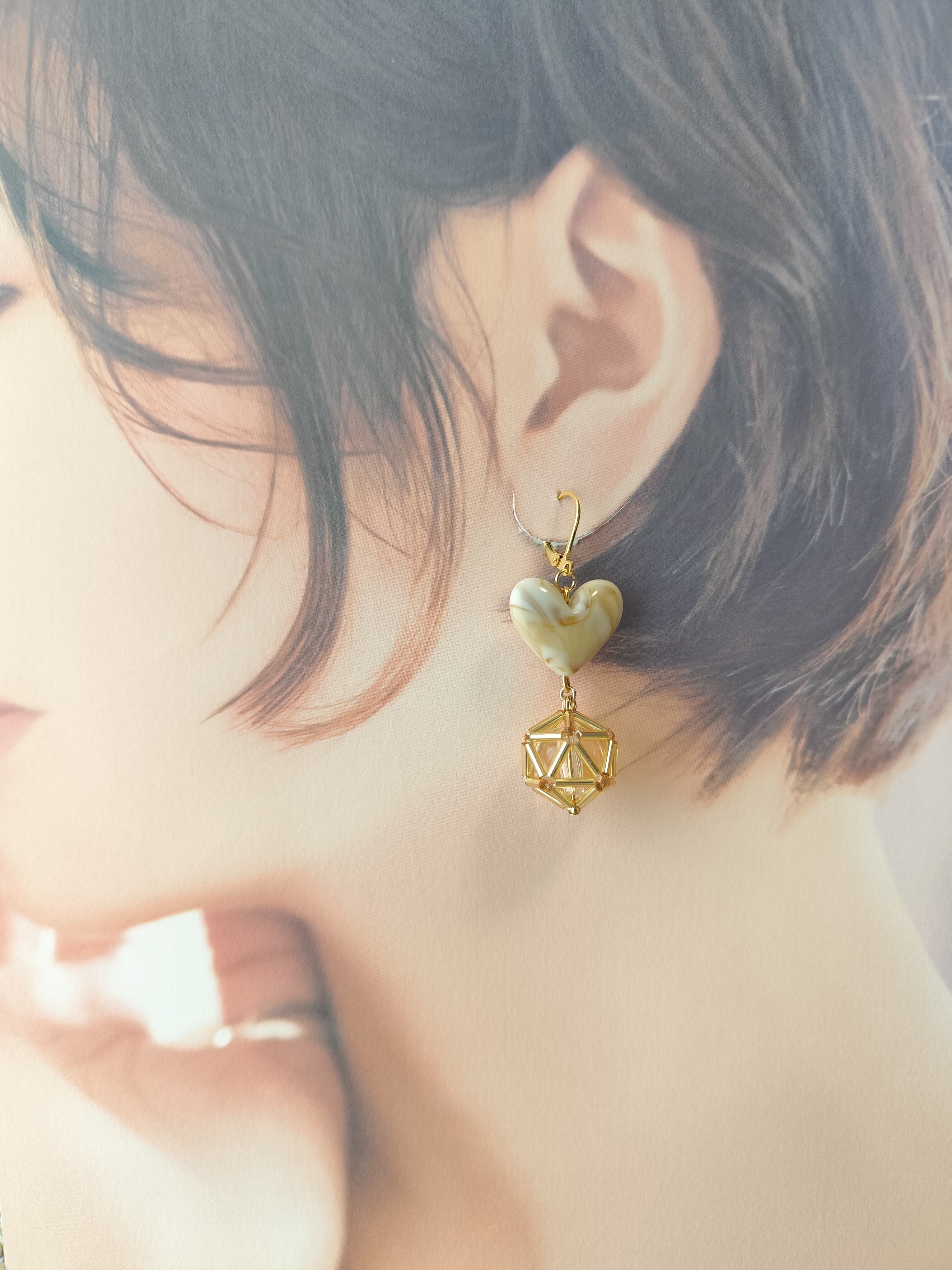 竹ビーズで編んだボールとマーブル模様の美味しそうなぷっくりハートを組み合わせたアクセサリーです。